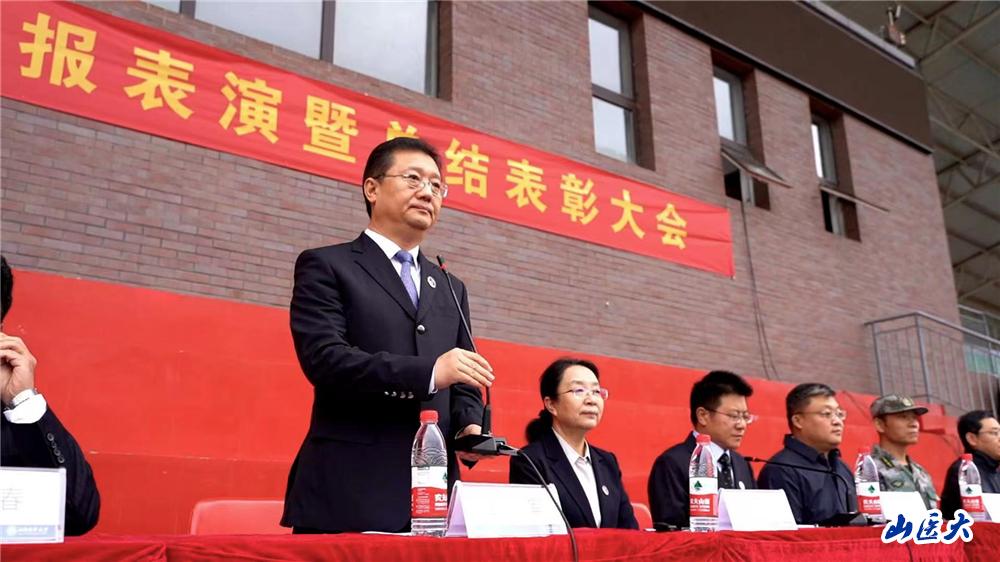 分列式結束后,參訓學生表演了槍操、隊列動作展示、戰場救護、戰術反恐、消防演練五個科目,他們動作精準、氣勢磅礴,透露出果敢與堅毅,散發著激情與夢想,展現了山醫學子堅忍不拔、勇敢頑強的戰斗作風。教官們為大家呈現了一場精彩的擒拿術表演,他們動作剛勁有力,一招一式盡顯軍人風采,贏得全場師生的陣陣掌聲和喝彩。