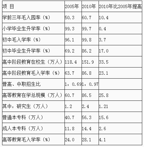 “十一五”時期,以鞏固提高義務教育水平、大力發展職業教育、提高高等教育質量為重點,組織實施了“教育改革發展八大重點工程”,促進各類教育發展水平全面提升。2006年普及九年義務教育工作順利通過國家驗收。小學、初中入學率連續五年保持在99%以上。高中階段教育在校生由2005年的118.4萬人增加到2010年的151.9萬人,高中階段毛入學率由63.7%提高到868%,基本實現了普通高中和中等職業學校招生比例大體相當。普通本專科在校生由40.7萬人增加到56.3萬人,在讀研究生由1.2萬人增加到2.4萬人,高等教育毛入學率由24%提高到281%。學前教育和特殊教育取得新進展,學前三年毛入園率由2005年的50.3%提高到2010年的60.7%,特殊教育在校生由5021人增加到8167人。社區教育和終身教育積極開展,累計培訓1600萬人次。
