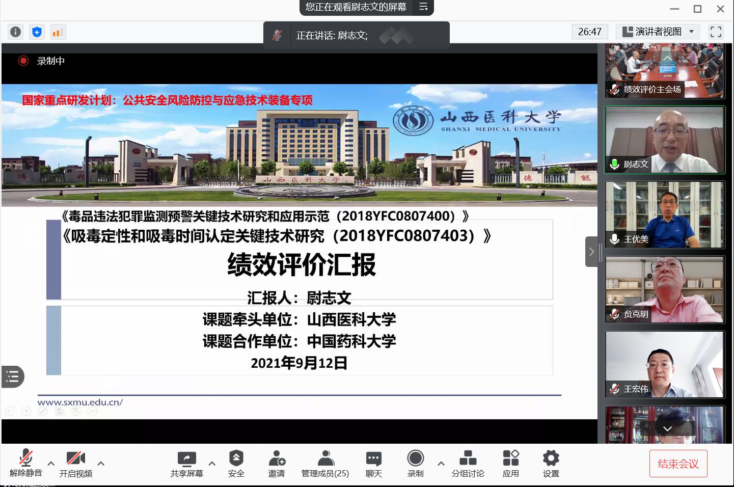 金秋季節,碩果累累;9月12日上午,法醫學院科研團隊又迎來了國家重點研發計劃項目課題“吸毒定性和吸毒時間認定關鍵技術研究”的績效評價會。會議首次采用線上線下結合的方式進行,科技處邵紅芳副處長主持,王宏偉副校長出席會議并致辭;專家組由中國人民公安大學羅亞平教授、公安部禁毒情報技術中心副主任王優美總工程師和徐鵬研究員、司法部司法鑒定科學研究院卓先義研究員、上海市公安局張玉榮教授、中國刑事警察學院朱昱教授、北京興和會計師事務所張興碩注冊會計師組成,參加會議的還有中國藥科大學徐慧教授、法醫學院院長贠克明教授、課題負責人、各子課題負責人、課題聯絡人和課題骨干。