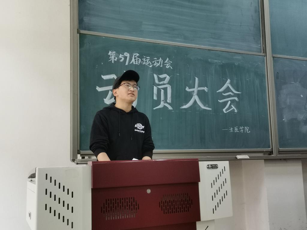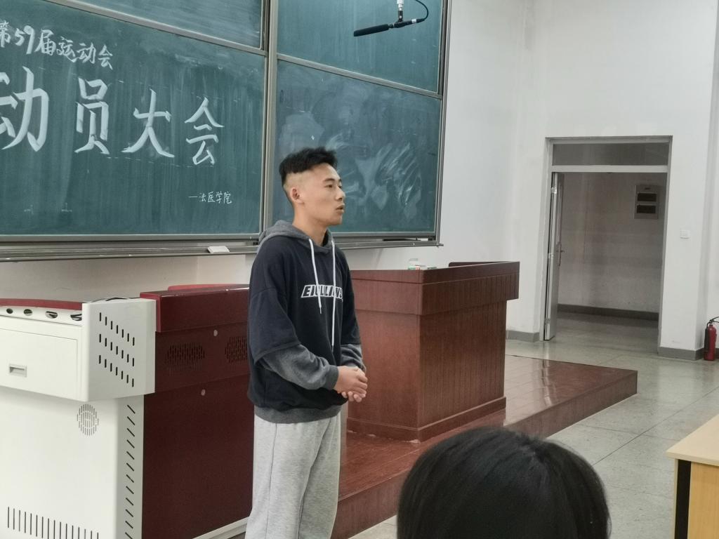 會議由18級主席張恒溢主持。張恒溢首先列舉了法醫學院在歷屆運動會中的輝煌成績。往屆運動會一直保持前四的好成績,上屆運動會更是取得了團體第二名的驕人成績,2017級的哈米拉,更是連續兩屆打破校運會的女子短跑記錄