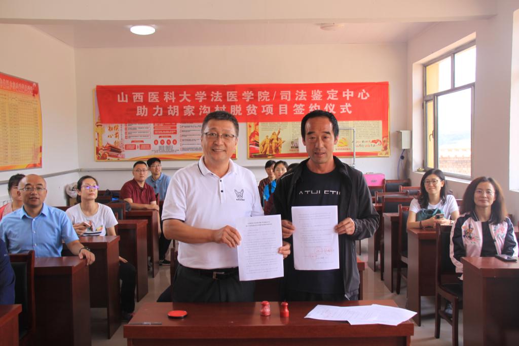 贠克明與胡家溝村主任簽訂“c7c7.app法醫學院、司法鑒定中心助力寧武縣迭臺寺鄉胡家溝村脫貧項目協議