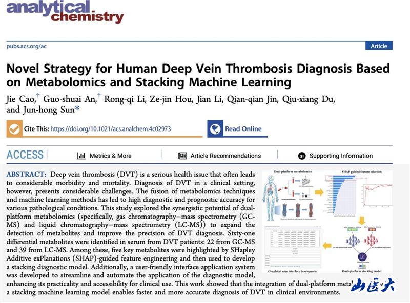 近日,由我校法醫學院曹潔副教授和博士生安國帥為共同第一作者,孫俊紅教授擔任通訊作者的科研團隊在國際分析化學領域頂級期刊《Analytical Chemistry》(中國科學院一區TOP期刊,影響因子6.7分)發表了題為“Novel Strategy for Human Deep Vein Thrombosis Diagnosis Based on Metabolomics and Stacking Machine Learning”的研究論文(https://pubs.acs.org/doi/10.1021/acs.analchem.4c02973),標志著代謝組學與機器學習技術結合在深靜脈血栓形成(DVT)診斷中的再次突破。