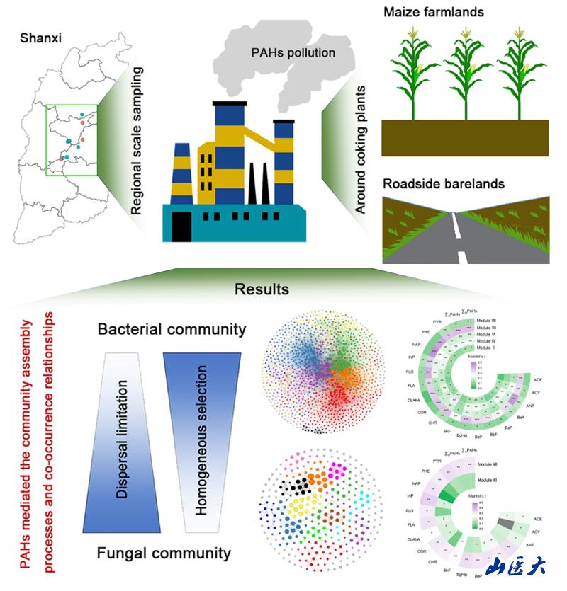 研究通過對山西省中部地區9個焦化廠(其中3個經過產業調整升級已全面關停)附近土壤樣地進行了調查研究,研究結果顯示經過產業調整升級全面關停的焦化廠附近土壤多環芳烴污染程度顯著較低,表明我省焦化行業調整升級已初顯成效,生態環境質量改善明顯。研究進一步評估多環芳烴污染對土壤細菌和真菌群落構建和多樣性維持機制的影響,結果表明相比于土壤真菌,多環芳烴對土壤細菌群落多樣性和共發生網絡的影響更大。在研究區域內,確定性過程(主要是均質性選擇)主導細菌的群落構建,隨機性過程(主要是擴散限制)主導真菌的群落構建,揭示了不同類型微生物對多環芳烴污染的敏感程度的差異及應對污染的不同組裝策略。研究篩選出一系列與多環芳烴降解相關的微生物標記物,包括Sphingobium、 Gemmatimonas、Fusarium、Verticillium、Humicola和 Didymella等,基于這些標記物結合機器學習算法成功構建了土壤多環芳烴污染程度評估模型,模型具有較高的準確性,表明了微生物作為環境法醫指示物種進行污染物診斷和評估的巨大潛力。
