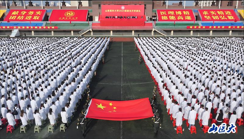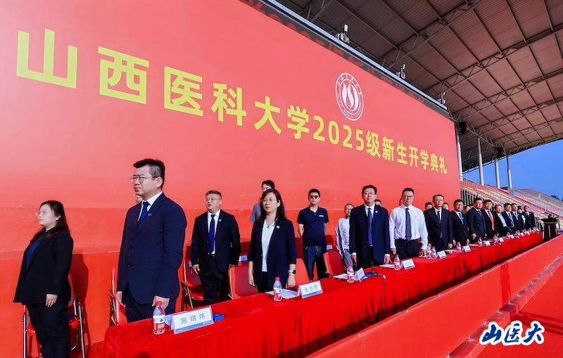9月14日上午,我校2025級新生開學典禮在中都校區風雨操場舉行。來自五湖四海的6225名新同學匯聚山醫,展現蓬勃朝氣,昂揚青春自信,共同迎接學業生涯的新起點。晉中市政府副市長張擁軍,清華大學長聘教授、基礎醫學院院長李海濤,華大集團相關專家,我校黨委書記王軍,校長解軍,校黨委副書記彭月蘭,省紀委監委駐校紀檢監察組組長、校黨委常委楊文斌,副校長張巖波,校黨委常委、副校長焦向英、武志芳,第二臨床醫學院黨委書記安?。諞渙俅慘窖г焊痹撼な╈陟康?,學校各職能部門、各培養單位負責人,新生思想政治輔導員,以及部分2025級新生的家長等參加了典禮。
