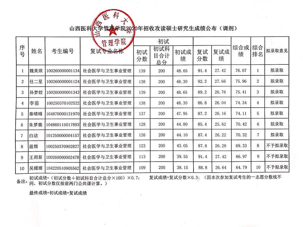 按照《c7c7.app2020年招收攻讀碩士學位研究生復試工作方案》要求,我院于2020年6月1日舉行社會醫學與衛生事業管理專業調劑考生復試工作,現對復試成績與擬錄取情況予以公示。