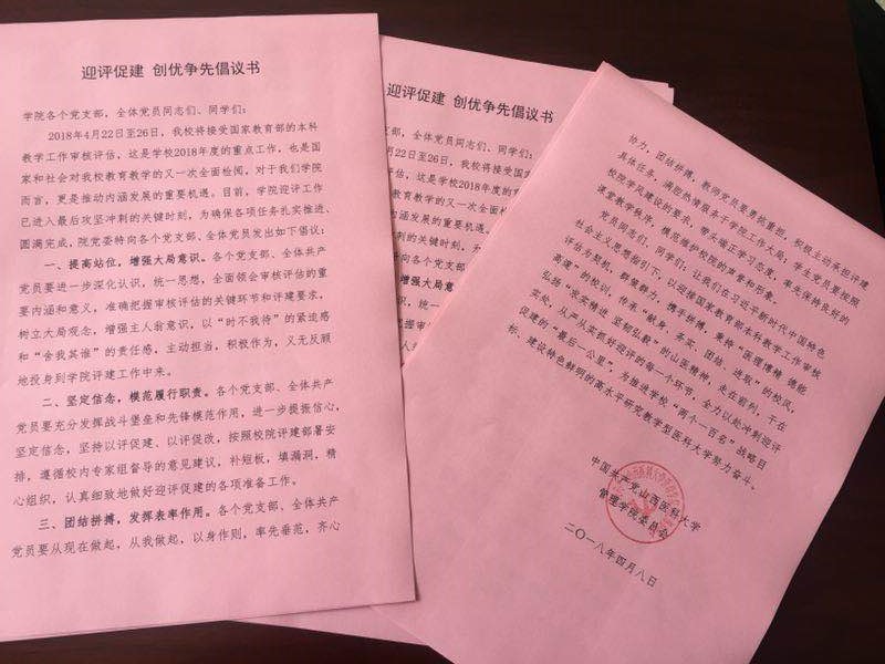 隨后,院黨委書記李紅梅指出,管理學院迎評工作已進入最后攻堅沖刺的關鍵時刻,為確保各項任務扎實推進,圓滿完成,院黨委向各個黨支部、全體黨員發出 “迎評促建 創優爭先”倡議書,倡議學院各個黨支部、全體黨員在迎評工作中主動擔當,積極作為,切實發揮戰斗堡壘和先鋒模范作用,真正在迎評促建工作中走在前列,干在實處。