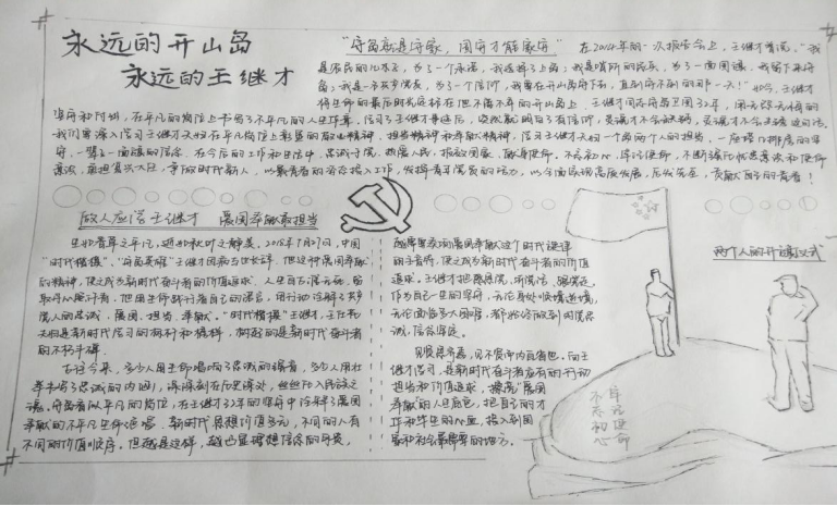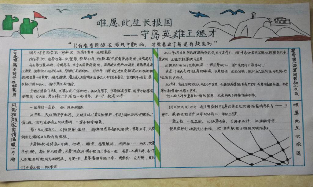 手抄報生動的展現出海島環境的艱辛,使我們感受到王繼才同志甘于寂寞,默默堅守的愛國奉獻精神;音頻主要錄制了我們學生黨員對于王繼才同志把青春年華全部獻給了祖國海防事業的感觸,并結合自身表達了作為學生黨員我們應該學習王繼才同志甘于寂寞、克服困難、無私奉獻的精神;學習心得主要是通過文字的形式描述了王繼才同志的舍家衛國,并表達出學生黨員通過學習王繼才同志的事跡對自身的反思。