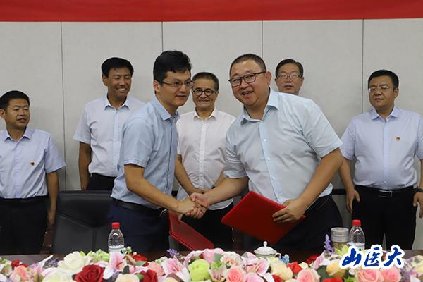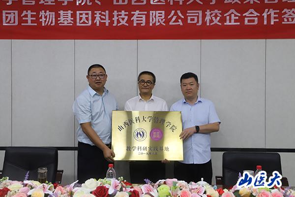 管理學(xué)院副院長(zhǎng)于琦代表學(xué)院與山西省醫(yī)藥集團(tuán)生物基因科技有限公司總經(jīng)理蘆賓簽署院企合作協(xié)議,并互相授牌。
