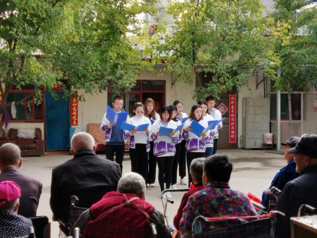 “我和我的祖國,一刻也不能分割,不論我走到哪里,都留下一首贊歌”....伴隨著同學們洪亮的歌聲,一首《我和我的祖國》拉開本次活動的帷幕。優美的旋律,動聽的歌聲,使在場的老人們也跟著忘我的哼唱,畫面溫馨而感人;同學們為大家宣講了《重陽節,品味習近平尊老敬賢的故事》和《老有所養》的國家政策,讓老年人從內心深處真正感受到祖國對他們的關愛;活力四射啦啦操,動感的節奏,青春的舞步,使在場的每一位老人眼前一亮,心情愉悅。活動全程老人們臉上都洋溢著開心的笑容,掌聲不斷。最后同學們在王院長的講解中參觀了敬老院。