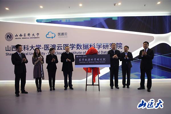 在與會代表的見證下,山西省衛生健康委員會黨組書記、主任武晉,山西省衛生健康委員會黨組成員、副主任馮立忠,山西云時代技術有限公司黨委書記、董事長陽軍,校黨委書記張俊龍,校黨委副書記、醫學數據科學研究院院長賀培鳳,校第一醫院黨委書記劉春,醫渡云副總裁、醫學數據科學研究院副院長黃楠共同為c7c7.app-醫渡云醫學數據科學研究院揭牌。