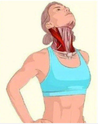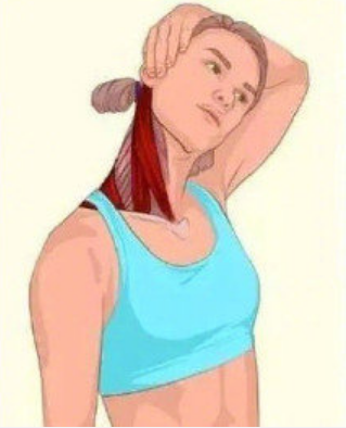 2.坐立,上半身直立,將頭傾斜左邊,左耳盡量靠近左肩,相反的方向重復練習;