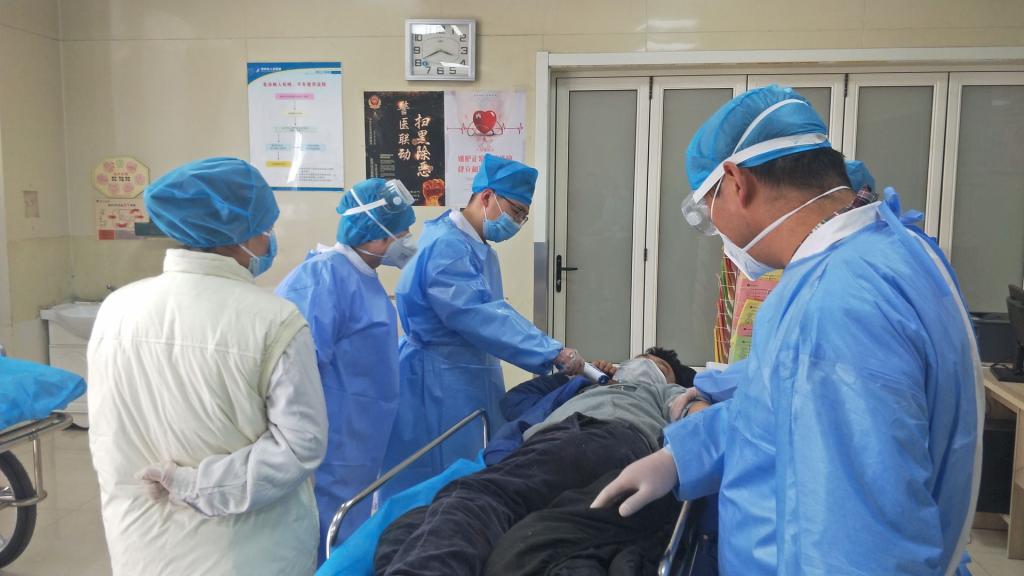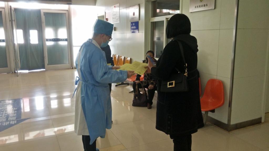 6號那天,由于還是有部分病人到醫(yī)院不戴口罩,所以我拿著防疫宣傳的傳單在醫(yī)院給病人們散發(fā)。然后在醫(yī)院門口碰到了匆匆忙忙的一家三口,我穿著醫(yī)院的防護(hù)服,他們可能以為我是大夫,趕緊和我說感覺自己胸悶,有一個親戚是從武漢回來的,在疫情擴大前到他們家串過門。一聽他們這么說,我感覺十分緊張,這是我目前為止接觸過的第一個有武漢接觸史的病人,我趕緊帶他們?nèi)フ伊藯畲蠓?。楊大夫做了更細(xì)致的詢問后,報告了急檢預(yù)檢分診和總值班。此時楊大夫與CT的大夫商量好先給做個CT掃描,于是大家全副武裝,給病人做了CT檢查,結(jié)果顯示左下肺斑片狀高密度影。雖然我不太懂這些專業(yè)的術(shù)語,但很明顯,肺部是不太正常的,再加上有武漢接觸史,大家頓時感到了事態(tài)的嚴(yán)重性。楊大夫趕緊指揮給他們安排了隔離房間,并上報院領(lǐng)導(dǎo)和科主任。醫(yī)務(wù)處、院感也紛紛打電話來指示工作并且詢問醫(yī)護(hù)人員和志愿者有無職業(yè)暴露,還囑咐大家做好防護(hù)。在等待檢查結(jié)果和領(lǐng)導(dǎo)指示的期間一家人明顯情緒也很慌張,楊大夫不停的安慰他們,我雖然也很緊張,但還是安慰了孩子,零零散散的說了許多生硬的安慰言語,和他說一定不會有事的,不要太緊張,完了疫情結(jié)束以后和他一起玩兒,等等等等。事后回想,當(dāng)時我的安慰言語實在是錯亂,并不像楊大夫一樣沉穩(wěn)。但在當(dāng)時的情況下,病人們在高度緊張的情緒下,對穿防護(hù)服的工作人員都充滿了期望,可以感覺到他們很是需要醫(yī)務(wù)人員的幫助,我的話也是稍微讓幫他們消除了一些恐慌吧。