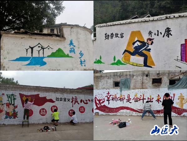墻體彩繪,美化鄉(xiāng)村“顏值”。2019級信息管理與信息系統(tǒng)專業(yè)任洪霞的暑期實踐是給家鄉(xiāng)做墻體彩繪,喜歡畫畫的她得知自己的工作是要在村子里做墻體彩繪時非常興奮。她和小伙伴們提前設計,準備墻繪顏料,整理素材,潛心創(chuàng)作。這是一項團隊活動,需要大家共同努力才能完成,大家分工明確,配合默契。當看到漂亮的彩繪效果時,他們都很高興,墻體彩繪除了能夠使文字、圖畫更具感染力和趣味性,同時也向村民宣傳了社會主義核心價值觀、脫貧攻堅、勤勞致富等思想,使鄉(xiāng)村更加富有色彩,更加彰顯活力。