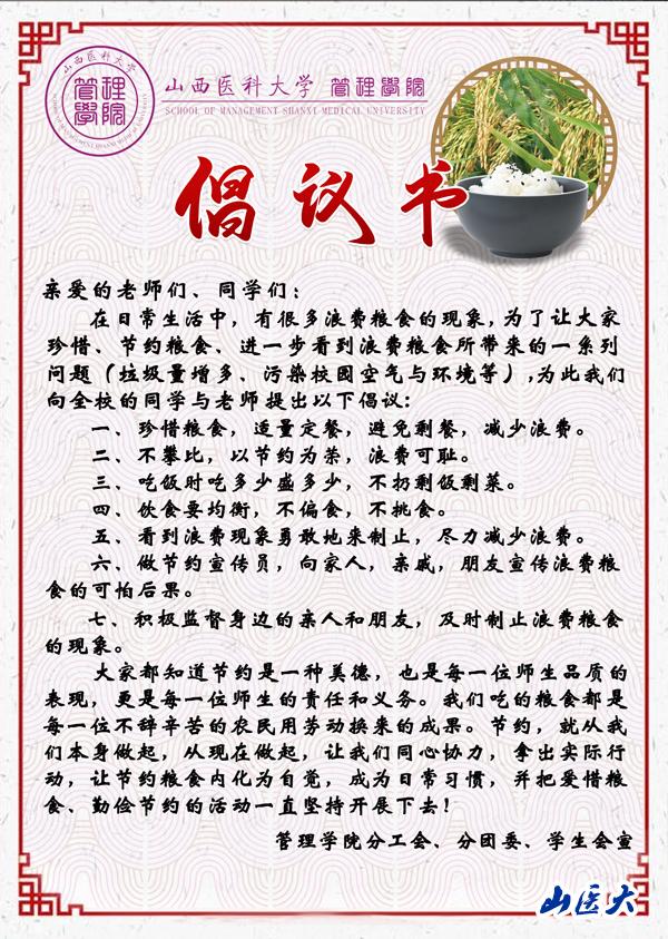 管理學院倡議,要珍惜每一餐飯、節約每一粒糧,對浪費糧食的人和事要主動批評譴責勸導,制止糧食浪費行為,讓“舌尖”節儉成為“心間”美德,共同創造文明、健康的生活方式。讓更多的人了解“光盤行動”,參與到“光盤行動”中來,避免“舌尖上的浪費”,做珍愛糧食、節約糧食的宣傳者和監督者。