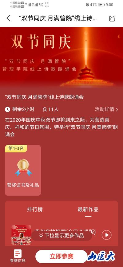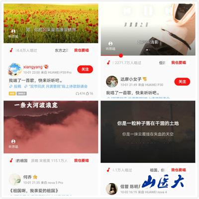 本次線上詩歌朗誦會在全名K歌平臺進行,學院全體師生積極參與,熱情高漲。師生們通過朗誦詩歌,歌唱歌曲等形式展現(xiàn)了對祖國母親的熱愛,對抗疫英雄的崇敬以及對傳統(tǒng)文化的熱愛。全院師生共評選出13件優(yōu)秀作品,通過10月2-3日投票與播放量評。鈧2019級信管陳明月同學摘得桂冠,教工劉楠老師獲得第二名,第三名是2019級公管劉麟輝同學。此外,2019級公管張育瀚和李凱兩位同學獲得最佳人氣獎稱號。