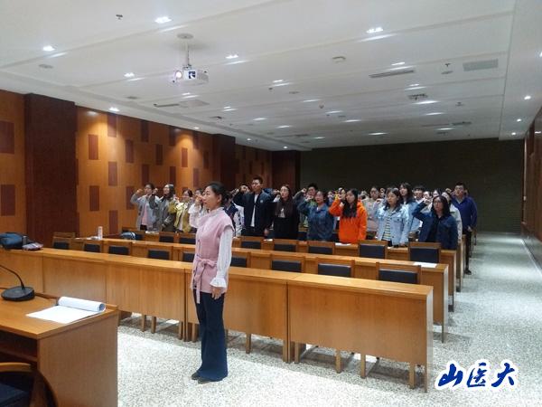 戴玥赟領(lǐng)誓,管理學院學生第一黨支部全體黨員懷著崇敬的心情在黨旗下重溫入黨誓詞。