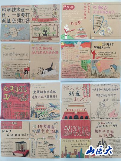 每幅手繪作品分別對應著一句名言,采用文字與繪畫相融合的形式對名言進行闡述,每一幅作品都是全體黨員經過查閱資料與深思熟慮后精心繪制而成,同學們用所學、所思、所悟,執手中之筆,描繪百年建黨歷史上波瀾壯闊的光輝歷程。