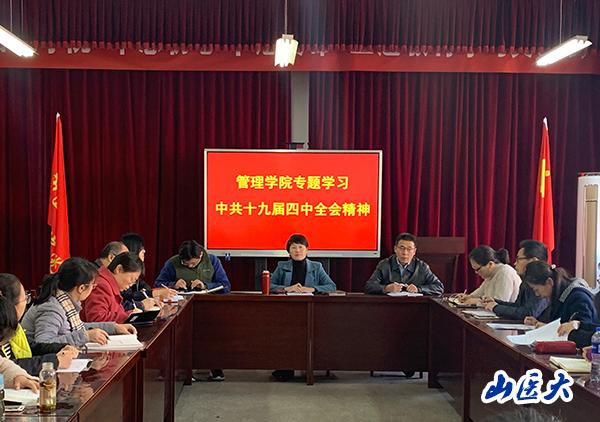 李紅梅對(duì)學(xué)習(xí)內(nèi)容的貫徹落實(shí)和近期工作作出安排部署。她指出,學(xué)習(xí)貫徹黨的十九屆四中全會(huì)精神是當(dāng)前和今后一段時(shí)期一項(xiàng)重大政治任務(wù),學(xué)院領(lǐng)導(dǎo)班子要帶頭學(xué)習(xí),學(xué)深一步,作出榜樣;要繼續(xù)深化綜合改革,堅(jiān)持和鞏固已有的改革成果,繼續(xù)抓好建章立制各項(xiàng)工作,抓好各項(xiàng)制度的貫徹落實(shí),提高辦學(xué)治院的能力和水平;要精心制定宣講方案,全方位、多角度、立體化宣傳解讀全會(huì)精神,迅速在學(xué)院興起學(xué)習(xí)貫徹全會(huì)精神的熱潮。各黨支部要把學(xué)習(xí)宣傳和貫徹落實(shí)好四中全會(huì)精神作為“不忘初心、牢記使命”主題教育的重要學(xué)習(xí)內(nèi)容,堅(jiān)持問(wèn)題導(dǎo)向,提高學(xué)習(xí)針對(duì)性,精心組織,系統(tǒng)謀劃,積極引領(lǐng)師生準(zhǔn)確把握核心要義、精神實(shí)質(zhì),深入領(lǐng)會(huì)豐富內(nèi)涵、重大要求,不斷提高政治站位,增強(qiáng)政治自覺(jué)。全體黨員要把原原本本學(xué)習(xí)《決定》,與學(xué)用習(xí)近平新時(shí)代中國(guó)特色社會(huì)主義思想結(jié)合起來(lái),下真功夫融會(huì)貫通理論脈絡(luò),學(xué)思結(jié)合,知行合一;要從黨和國(guó)家事業(yè)全局準(zhǔn)確把握黨中央決策部署,進(jìn)一步增強(qiáng)“四個(gè)意識(shí)”,充分認(rèn)識(shí)中國(guó)特色社會(huì)主義制度和國(guó)家治理體系的顯著優(yōu)勢(shì),進(jìn)一步堅(jiān)定“四個(gè)自信”,要牢牢聚焦黨中央確立的任務(wù)目標(biāo),緊扣立德樹(shù)人的職責(zé)使命,進(jìn)一步在堅(jiān)決做到“兩個(gè)維護(hù)”上見(jiàn)思想、見(jiàn)行動(dòng),切實(shí)把學(xué)習(xí)成果轉(zhuǎn)化為推動(dòng)學(xué)院發(fā)展的實(shí)際成效。