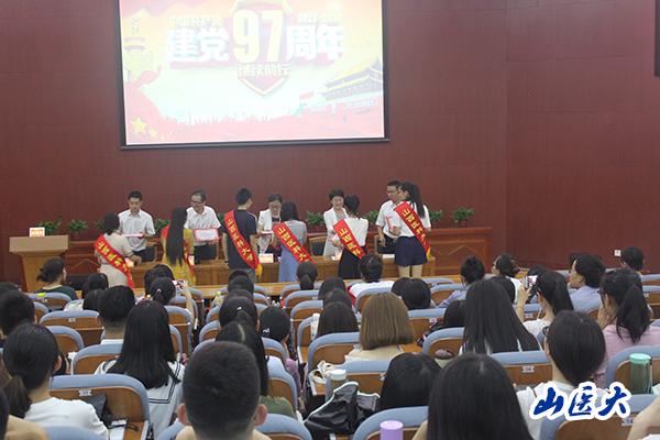 會議在莊嚴的國歌聲中正式開始。院黨委委員、副院長袁永旭宣讀表彰決定;賀培鳳等校院領導為獲得優秀共產黨員、優秀黨務工作者和先進基層黨組織榮譽稱號的個人和集體頒獎;教工第一黨支部書記于琦、學生黨員張琳分別代表受表彰先進黨支部和優秀共產黨員發言,暢談了對建黨97周年的認識和感想,表達了學院師生不忘初心跟黨走,牢記使命勇擔當的堅定信心。