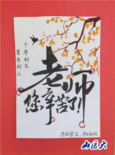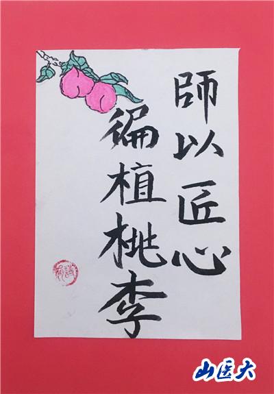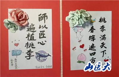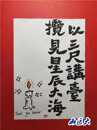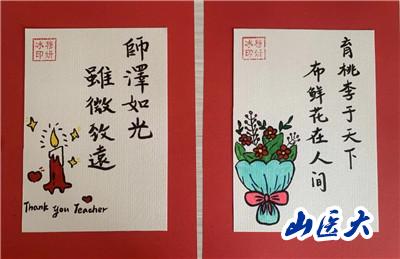 此次活動內容主要圍繞“一朝沐杏雨,一生念師恩”主題來展開,支部黨員們通過繪畫、書法、制作手工賀卡等形式,制作了“桃李滿天下,春暉遍四方”“老師您辛苦了”“師以匠心,遍植桃李”“尚感恩情懷,崇尊師美德”等卡片。同學們在動手實踐的過程中體悟老師們的辛苦付出,用真摯且具有創意美感的作品表達他們對老師們精心培養的感激之情。