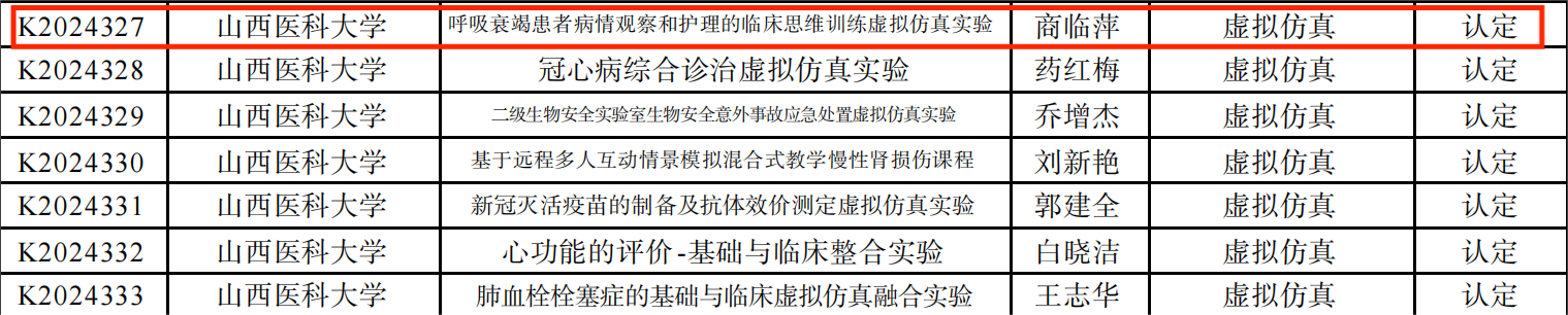 近日,山西省教育廳對2024 年山西省一流課程進行專家評審、網絡公示等環節,確定了 2024 年山西省一流本科課程立項名單,并在山西教育廳網站予以公布。護理學院商臨萍院長負責的虛擬仿真課程《呼吸衰竭患者病情觀察和護理的臨床思維訓練虛擬仿真實驗》獲得省級一流課程;張穎惠副院長負責的《內科護理學》線下課程獲得省級一流課程。