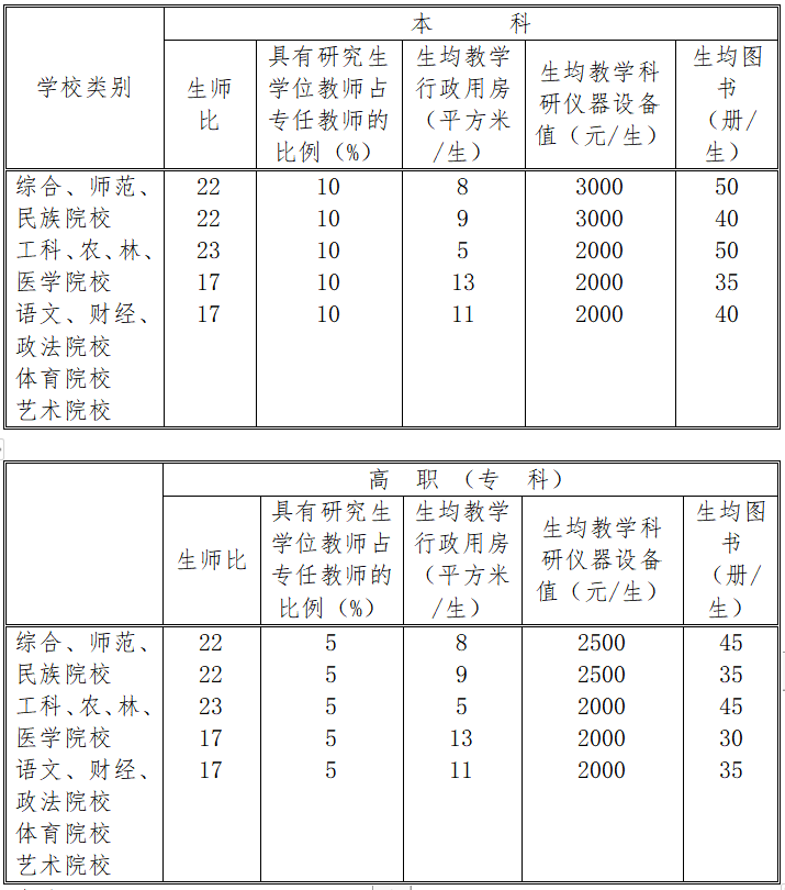 ⒉凡生師比指標不高于表中數值,且其它指標不低于表中數值的學校為合格學校。