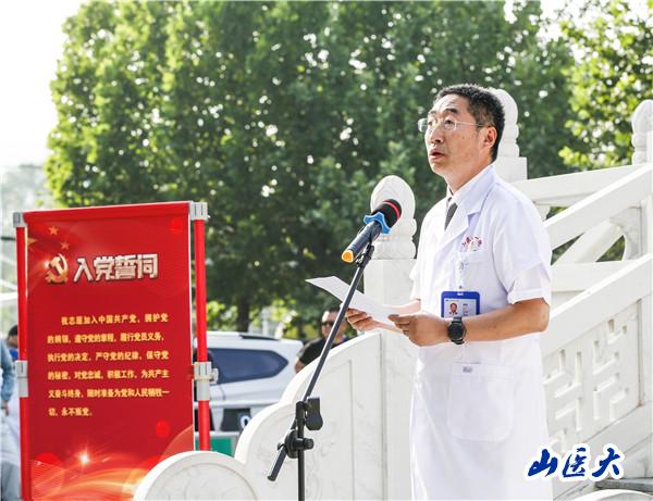 徐鈞在講話中指出,今天我們莊嚴舉行“光榮在黨50年”紀(jì)念章頒發(fā)暨新黨員入黨宣誓儀式,是一次深刻的黨性教育和精神洗禮,具有非常重要的意義。他強調(diào),共產(chǎn)黨員是一種稱號,是一種榮譽,更是一種神圣的責(zé)任,希望每一名黨員用一生的實際行動來踐行共產(chǎn)黨員的誓言。他向全院黨員提出三點要求。一要堅守為民初心,永葆黨員本色。要始終踐行黨的宗旨,站穩(wěn)人民立。崾厝嗣袂榛常芮型嗣袢褐詰難飭,將“人民”二字刻進骨子、烙在心上;要持之以恒把初心體現(xiàn)在工作中、體現(xiàn)到行動上,切實提高醫(yī)療技術(shù)水平、提升醫(yī)療服務(wù)效能,在醫(yī)院全方位高質(zhì)量建設(shè)發(fā)展中持續(xù)發(fā)力和有所作為。二是要立足本職崗位,爭做模范先鋒。要以“對生命負責(zé)”的態(tài)度,在平凡中感受工作的偉大,以不平凡的態(tài)度對待工作,腳踏實地做好每一件工作,始終弘揚“甘為人梯”的奉獻精神,以昂揚的斗志擔(dān)負起時代賦予的責(zé)任;要時刻牢記在關(guān)鍵時刻迎難而上、沖鋒在前的責(zé)任擔(dān)當(dāng),為人民群眾的健康保駕護航。三是要恪守政治品格,忠誠干凈擔(dān)當(dāng)。要嚴格遵守黨規(guī)黨紀(jì),帶頭落實《醫(yī)療機構(gòu)工作人員廉潔從醫(yī)九項準(zhǔn)則》等行業(yè)法規(guī),不斷規(guī)范醫(yī)療服務(wù)行為,持續(xù)改進各項服務(wù)流程、服務(wù)措施,切實改善人民群眾就醫(yī)體驗。