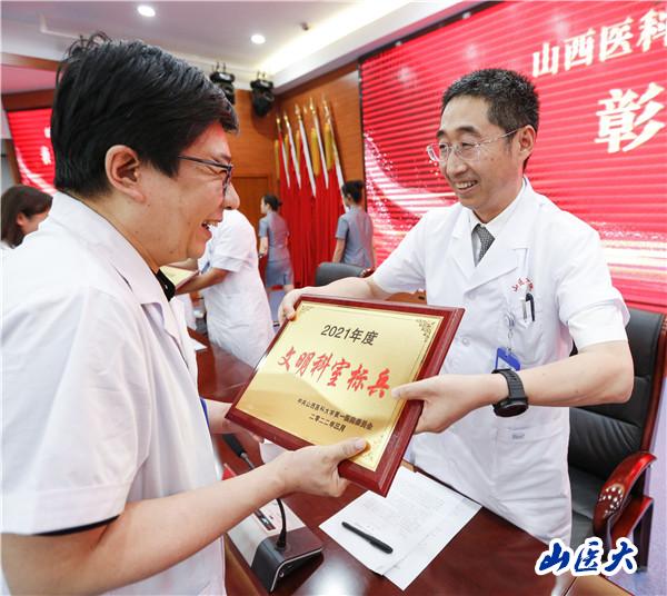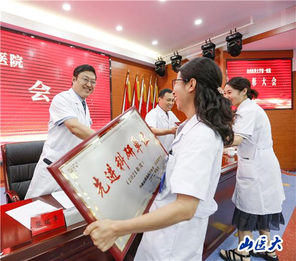 會上,黨委副書記吳旭東宣讀了2022年“兩優一先”表彰決定;黨委委員、紀委書記武瑞明宣讀了受山西省衛健委表彰的“黨建品牌”優秀案例名單,以及《山西省人力資源和社會保障廳 山西省衛生健康委員會關于給予劉虹同志記大功獎勵的決定》;黨委委員、副院長范雙民宣讀了2021年度先進集體和先進個人的表彰決定;副院長韓清華宣讀了文明科室標兵、文明科室和文明職工的表彰決定。全體院領導為受到表彰的先進集體、先進個人代表頒發了獎牌和證書。