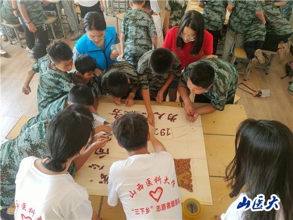 同時(shí),隊(duì)員們對(duì)困境家庭兒童與留守兒童進(jìn)行免費(fèi)體檢、韋氏智力測(cè)試、心理健康評(píng)估,開(kāi)展了愛(ài)黨愛(ài)國(guó)教育、軍訓(xùn)、課業(yè)輔導(dǎo)、消防安全健康教育等系列主題夏令營(yíng)活動(dòng)。通過(guò)繩結(jié)操作訓(xùn)練、豆子畫(huà)體驗(yàn)等形式,豐富了留守兒童的暑期生活。孩子們?cè)诶蠋熀完?duì)員們的帶領(lǐng)之下,端正了學(xué)習(xí)態(tài)度,補(bǔ)足了精神之鈣,增強(qiáng)了愛(ài)國(guó)情懷。