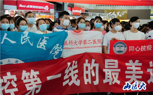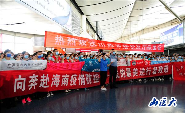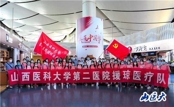 8月16日,在海南省疫情防控的關鍵時刻,由51名醫護人員組成的我校第二醫院援瓊抗疫醫療隊,在副院長原大江的帶領下,加入山西省援瓊醫療隊,火速奔赴海南省支援一線抗疫工作。第二醫院黨委書記李保,黨委副書記、院長趙斌到太原武宿國際機場為醫療隊送行。醫療隊包括內科、外科、急診、重癥等多個學科的醫護技術骨干,多名隊員都是親歷支援湖北、上海、吉林等地抗疫的精英,擁有著豐富的一線作戰經驗。