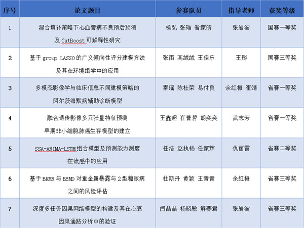 大賽總決賽研究生組共決出一等獎20名。學校重大疾病風險評估山西省重點實驗室張巖波教授指導的楊弘、張瑜、昝家昕同學參賽作品《混合填補策略下心血管病不良預后預測及CatBoost可解釋性研究》 經過激烈角逐,從全國1754組研究生參賽隊中脫穎而出,榮獲國賽一等獎。