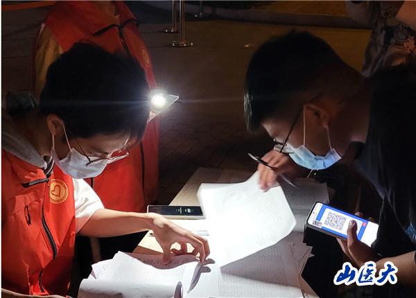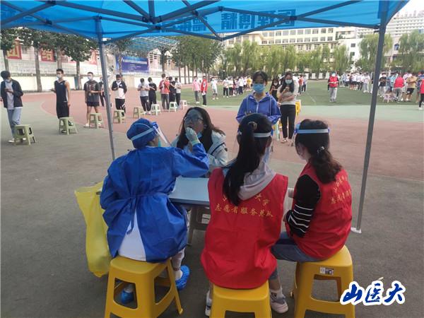 影像學院研究生志愿者郭俊婷和王莉早早的等在校門口,聽從老師安排并做好自身防護,組織學生排隊進行核酸,“同學,請出示一下你的核酸碼”,“請掃一下桌面上的二維碼”,“坐下,身體前傾”,“你的信息是×××,電話號碼是×××”,這樣的話一天要重復幾百次。