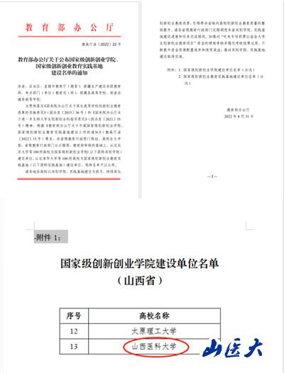 為全面貫徹落實《國務院辦公廳關于深化高等學校創新創業教育改革的實施意見》和《國務院辦公廳關于進一步支持大學生創新創業的指導意見》文件精神,教育部2022年面向全國高校建設100個國家級創新創業學院和100個國家級創新創業教育實踐基地。山西省2所高校入選國家級創新創業學院,我校是全國入選國家級創新創業學院的唯一醫學類院校。
