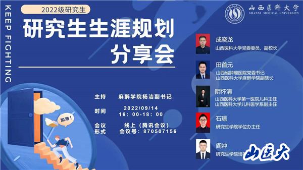 9月14日下午,迎澤校區疫情防控專班第四組線上舉辦了研究生生涯規劃分享會。會議邀請了校黨委常委、副校長成曉龍,附屬腫瘤醫院黨委書記、麻醉學院副院長田首元,第一醫院兒科主任、兒科醫學系副主任陰懷清,研究生學院學位辦主任石璟,研究生學院培養科科長閻沖進行專題分享,工作組輔導員劉斌、范晉楠、范靜和在酒店靜態管理的全體研究生參加會議。會議由工作組組長、麻醉學院黨總支副書記楊潔主持。