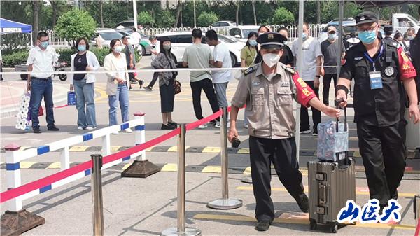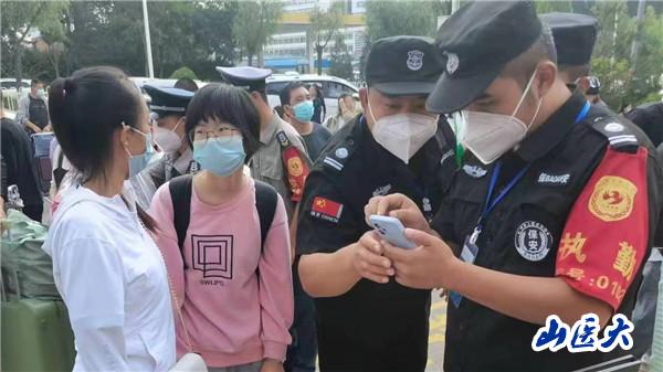 在校門口,安保人員嚴格執(zhí)行疫情防控有關(guān)要求,嚴格落實新生“四碼一書一測”(四碼:掃場所碼、行程碼、健康碼、核酸采樣碼,一書:入學(xué)通知書,一測:測量體溫)入校檢查制度,校外無證人員、外來車輛及無牌電動車嚴禁入校,嚴守學(xué)校疫情防控第一道防線。