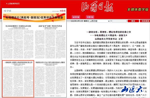 10月11日,《山西日報》“學思”版刊發校黨委書記王軍的理論宣傳文章《一部政治性、思想性、理論性俱佳的扛鼎之作——評電視理論片<再趕考·新擔當>》。