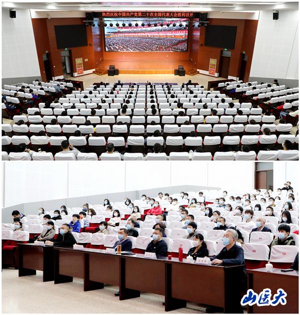 10月16日上午10時(shí),中國(guó)共產(chǎn)黨第二十次全國(guó)代表大會(huì)在北京人民大會(huì)堂隆重召開(kāi),習(xí)近平總書(shū)記代表十九屆中央委員會(huì)向大會(huì)作報(bào)告。我校黨員干部、師生醫(yī)護(hù)員工以集中收看與分散自主收看相結(jié)合的形式收聽(tīng)收看。校黨委理論學(xué)習(xí)中心組、處級(jí)以上干部、各學(xué)院學(xué)生代表在中都校區(qū)、迎澤校區(qū)和第一醫(yī)院、第二醫(yī)院、口腔醫(yī)院的10個(gè)集中收看點(diǎn)收看黨的二十大開(kāi)幕會(huì)實(shí)況。各基層黨組織和黨支部組織師生醫(yī)護(hù)通過(guò)網(wǎng)絡(luò)、電視、廣播等形式,因地制宜在實(shí)驗(yàn)室、臨床一線、辦公室、教室、餐廳等地點(diǎn)收聽(tīng)收看大會(huì)盛況。