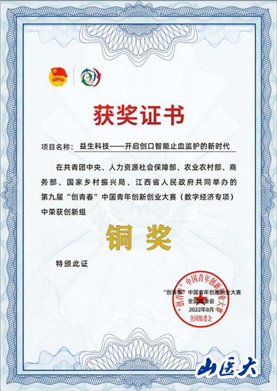 第九屆“創(chuàng)青春”中國青年創(chuàng)新創(chuàng)業(yè)大賽開展以來,學(xué)校高度重視、精心組織、認(rèn)真部署,廣泛動員全校師生積極參與。經(jīng)大賽全國組委會評審、審核確認(rèn)后,我校2項作品從全國眾多高質(zhì)量參賽作品中脫穎而出。其中,數(shù)字經(jīng)濟專項賽道的《益生科技——開啟創(chuàng)口智能止血監(jiān)護的新時代》獲得創(chuàng)新組銅獎,科技創(chuàng)新專項賽道的《優(yōu)瑞健康——膀胱癌早篩的領(lǐng)航者》獲得創(chuàng)新組優(yōu)秀獎。