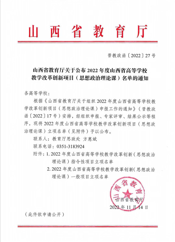 近日,山西省教育廳印發了《關于公布2022年度山西省高等學校教學改革創新項目(思想政治理論課)名單的通知》(晉教政函[2022]27號),我校申報的4項思想政治理論課教學改革創新項目全部獲批立項。其中,《大中小學思政課教師隊伍一體化建設研究——以呂梁市為例》獲批指令性項目,《“大中小學思政課一體化”視域下教師專業能力提升機制研究》《歷史主動精神融入醫學院校“馬克思主義基本原理”課程創新路徑研究》以及《勞動教育融入高校思想政治理論課教學研究》3個項目獲批一般項目。