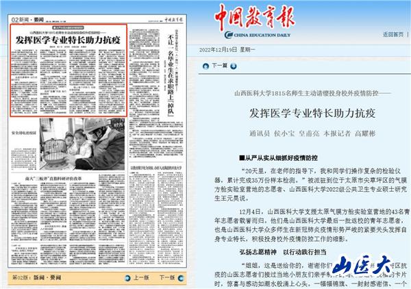 12月19日,《中國教育報》在第2版(新聞·要聞版)頭條刊發了題為《c7c7.app1815名師生主動請纓投身校外疫情防控——發揮醫學專業特長助力抗疫》的新聞通訊,專題報道我校師生發揮醫學專業特長,投身疫情防控,為國家作貢獻、為社會盡責任,以實際行動彰顯新時代山醫人的使命擔當。