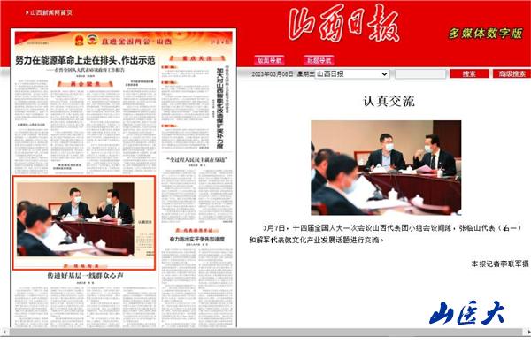 3月7日,《山西日報》第06版:“直通全國兩會·山西”以大幅新聞照片的形式報道了第十四屆全國人大代表、我校校長解軍在十四屆全國人大一次會議山西代表團小組會議間隙,與一同參會的張臨山代表就文化產業發展等話題開展交流。