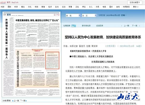 3月13日,《光明日報》第4版“要聞”刊發新聞通訊《堅持以人民為中心發展教育,加快建設高質量教育體系》,就“培養復合型公共衛生人才”專訪全國人大代表、農工黨山西省委會副主委、我校校長解軍。