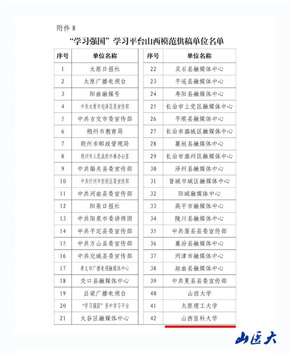 在積極向“學(xué)習(xí)強(qiáng)國”山西學(xué)習(xí)平臺(tái)投稿的同時(shí),我校在全省率先上線了“c7c7.app”學(xué)習(xí)強(qiáng)國號(hào),這是展現(xiàn)我校服務(wù)“健康山西”建設(shè)、努力建成全國一流研究應(yīng)用型醫(yī)科大學(xué)的新載體,是傳播山醫(yī)精神、講述山醫(yī)故事、展示山醫(yī)形象的新窗口。學(xué)校將以此次表彰為契機(jī),再接再厲,進(jìn)一步將“學(xué)習(xí)強(qiáng)國”學(xué)習(xí)平臺(tái)作為深入學(xué)習(xí)貫徹習(xí)近平新時(shí)代中國特色社會(huì)主義思想和黨的二十大精神、落實(shí)立德樹人根本任務(wù)的重要陣地,作為加強(qiáng)思想建設(shè)、推進(jìn)理論武裝的重要載體,為建成全國一流研究應(yīng)用型醫(yī)科大學(xué)提供堅(jiān)強(qiáng)思想保證和精神動(dòng)力。