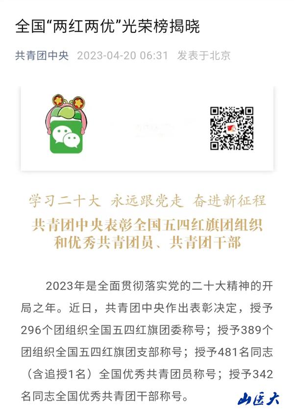 服務(wù)、美育教育、組織建設(shè)等方面取得了諸多成效,團組織的凝聚力、吸引力、服務(wù)力和大局貢獻(xiàn)度不斷提升,在建設(shè)全國一流研究應(yīng)用型醫(yī)科大學(xué)的生動實踐中貢獻(xiàn)青春力量。