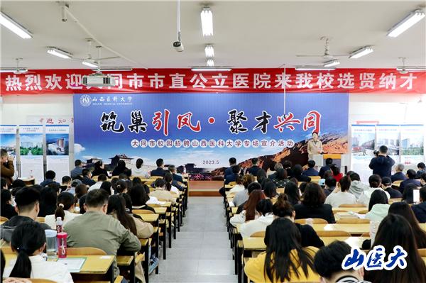 為進一步加強校地合作,深入開展2023年“書記校長訪企拓崗促就業”專項行動,5月5日下午,我校在迎澤校區舉辦“筑巢引鳳·聚才興同”大同市校園招聘專場宣介活動。校黨委副書記彭月蘭,校黨委常委、副校長劉春出席會議。大同市委組織部副部長鄭天杰,大同市衛健委黨組書記、主任紀青,大同市衛健委黨組成員、副主任張曉瓊,大同市第一人民醫院黨委書記、院長閆莉,大同市第二人民醫院工作組組長楊波,大同市第三人民醫院院長張寶成,大同市第四人民醫院黨委書記徐占有,大同市第五人民醫院院長張強世,大同市中醫醫院黨總支書記、院長姜世瑞等領導出席會議。校黨委人才工作部、教務部、醫院管理部、研究生學院、畢業生就業指導中心等相關部門負責人及200余名2023屆應屆畢業生參加會議。會議由畢業生就業指導中心主任郭建鍇主持。