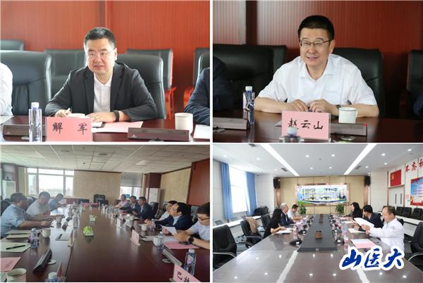 5月27日-28日,校長解軍,校黨委常委、副校長趙文軍帶領學校辦公室、發展規劃部、教務部、公共衛生學院等相關部門負責人赴內蒙古醫科大學調研交流。內蒙古醫科大學黨委書記、校長趙云山,黨委常委、副校長魯海文及有關部門負責同志會見了解軍校長一行。