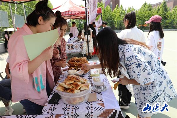 護理學院的維吾爾族姑娘們準備的新疆集體舞蹈獲得了最受歡迎表演稱號,苗族同學制作的苗族風情服飾海報獲得了最受歡迎海報,“新疆美食”展位用極具特色的烤包子、咸味奶茶、炸馓子和酸奶疙瘩俘獲了一票“吃友”的心。各民族展位也極具特色,藏族展位的同學們準備了藏族的酥油茶、小吃和藏式耳環;土家族展位的同學大方熱情地分享了來自家鄉的美食和茶葉,準備了土家族相關的知識競答;簪花展位的“小攤主們”設置了簪花手作體驗項目,邀請前來的同學們自己制作體驗這項古老民間藝術;漢服展位的陳丹同學親手制作的帷帽和木簪深受同學們的喜愛;艾德萊斯綢展位的伊麗姆努爾同學向大家介紹了維吾爾族的艾德萊斯工藝,她親手制作的艾德萊斯綢花帽也是同學們參觀拍照的熱門打卡地之一。維吾爾族同學們除了舞蹈之外,本次還親情演唱了維吾爾族民歌,通過歌聲表達了同學們對祖國的熱愛。