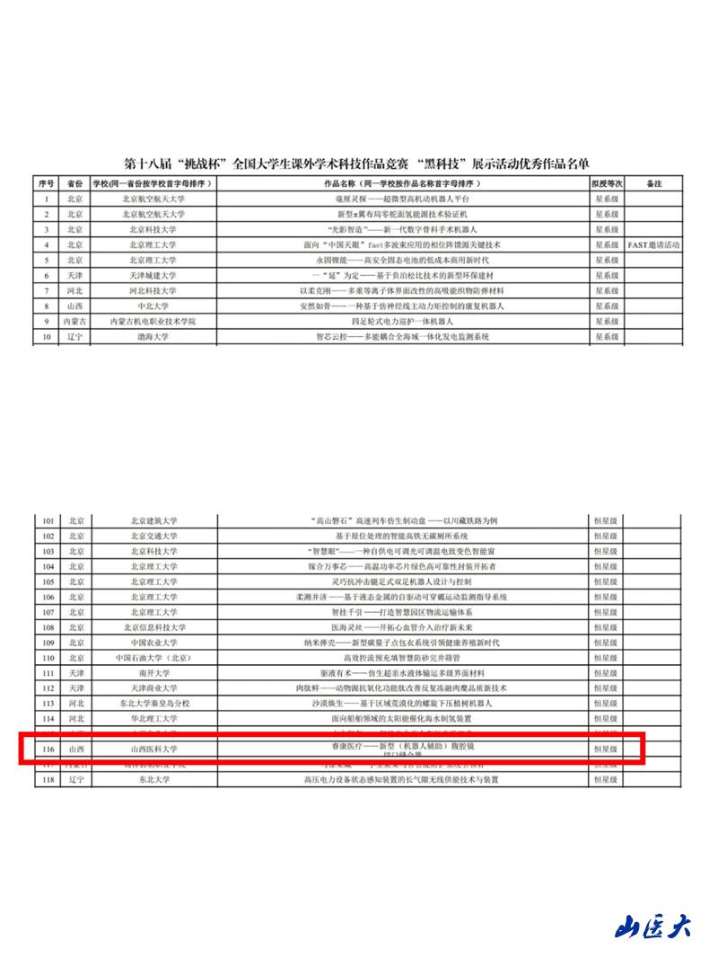 我校參賽作品《?狄攪啤灤停ɑ魅爍ㄖ└骨瘓登鋅詵旌掀鰲凡捎孟冉際,為腹腔鏡手術(shù)提供了更為高效和精準(zhǔn)的縫合解決方案,醫(yī)療專業(yè)人員可以利用這一創(chuàng)新工具進(jìn)行更靈活、個(gè)性化的切口縫合,填補(bǔ)了業(yè)界關(guān)于腹部大切口、微創(chuàng)全層縫合器械的空白,最終斬獲“恒星”級(jí)獎(jiǎng)項(xiàng)。共青團(tuán)山西省委向我校發(fā)來感謝信,祝賀我校在此次賽事中取得的優(yōu)異成績(jī),充分肯定了我校為山西省參加該項(xiàng)賽事以來歷史最好成績(jī)所作出的積極貢獻(xiàn)。
