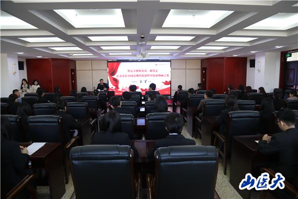 12月9日上午,校黨委書記王軍在中都校區教學辦公樓五層會議室以“堅定不移聽黨話、跟黨走,讓青春在中國式現代化進程中綻放絢麗之花”為題,為青年學生代表講授了一堂生動的思政課。