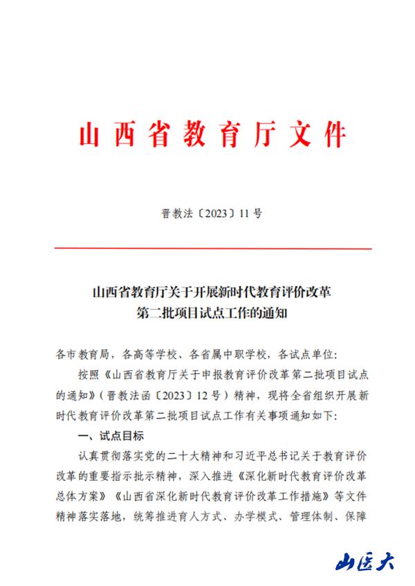 山西省新時(shí)代教育評(píng)價(jià)改革第二批項(xiàng)目試點(diǎn)聚焦解決教育評(píng)價(jià)改革工作中的重難點(diǎn)問題和破除“五唯”頑瘴痼疾,圍繞改革黨委政府教育工作評(píng)價(jià)、用人評(píng)價(jià)、學(xué)校評(píng)價(jià)、教師評(píng)價(jià)、學(xué)生評(píng)價(jià)等重點(diǎn)領(lǐng)域,加強(qiáng)先行先試、示范引領(lǐng),大膽探索推進(jìn)改革的有效路徑。2023年8月,根據(jù)省教育廳相關(guān)通知要求,由學(xué)校教務(wù)部組織,全面啟動(dòng)了項(xiàng)目申報(bào)工作,經(jīng)過省教育廳組織專家評(píng)審、研究審定,我校最終有兩個(gè)項(xiàng)目成功獲批。